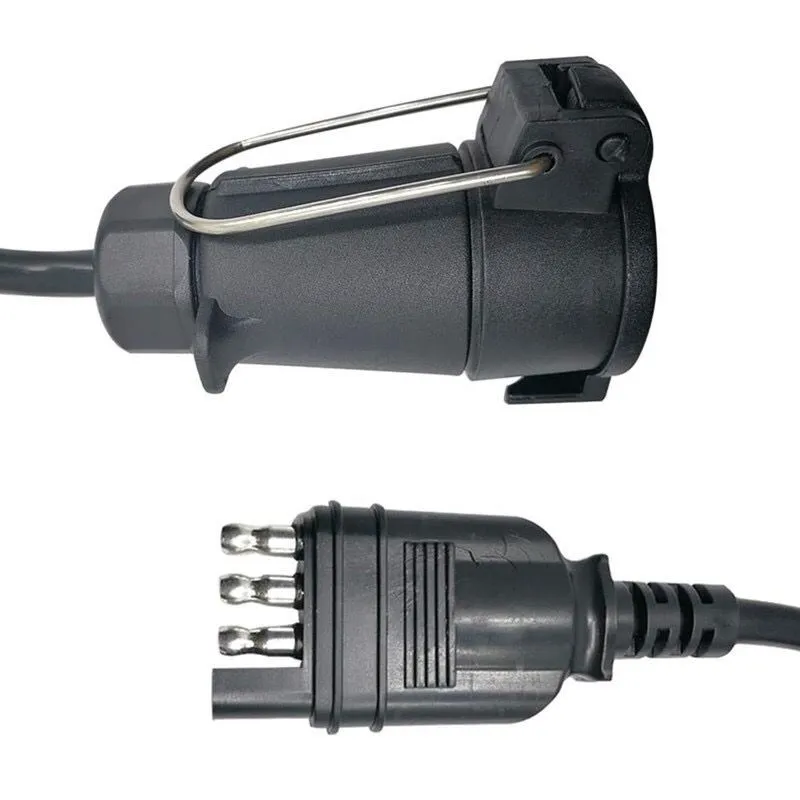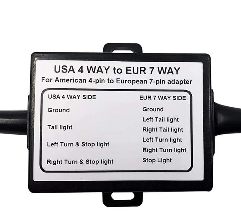 Этот надёжный и простой в использовании адаптер предназначен для соединения американской 4‑контактной (USA 4‑pin flat) розетки фаркопа с европейской 7‑контактной (ISO 1724 round) вилкой прицепа. Встроенный модуль разделяет сигналы стопа и поворотов, обеспечивая корректную работу всех световых функций без вмешательства в штатную электропроводку автомобиля