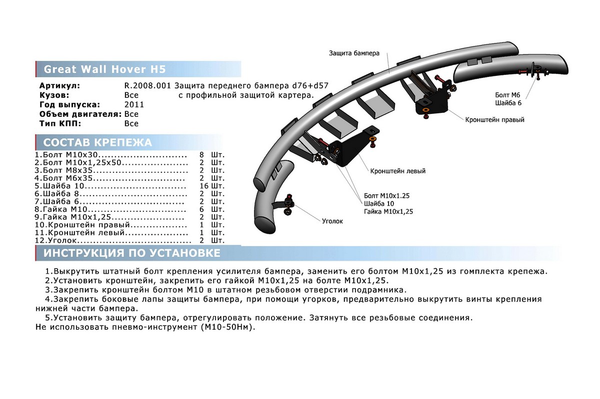 Фото Защита переднего бампера d76+d57 с профильной защитой картера Great Wall Hover H5 2011-2015