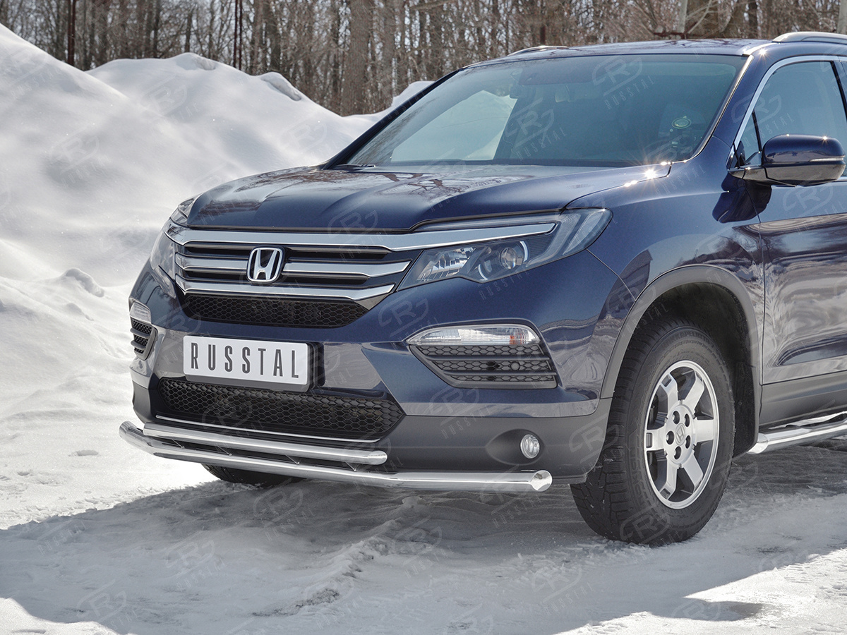 HONDA PILOT 2016- Защита переднего бампера d63 секции-d42 дуга HPZ-002919 производится из итальянской нержавеющей высококачественной полированной стали марки AISI 304. Идеально подходит по заводским параметрам, и устанавливается без дополнительных изменений в кузове. Вся продукция сертифицирована. Мы производим аксессуары с 2006 года. В распоряжении компании имеются собственные производственные площадки, поэтому вся работа производится без подрядчиков и посредников.