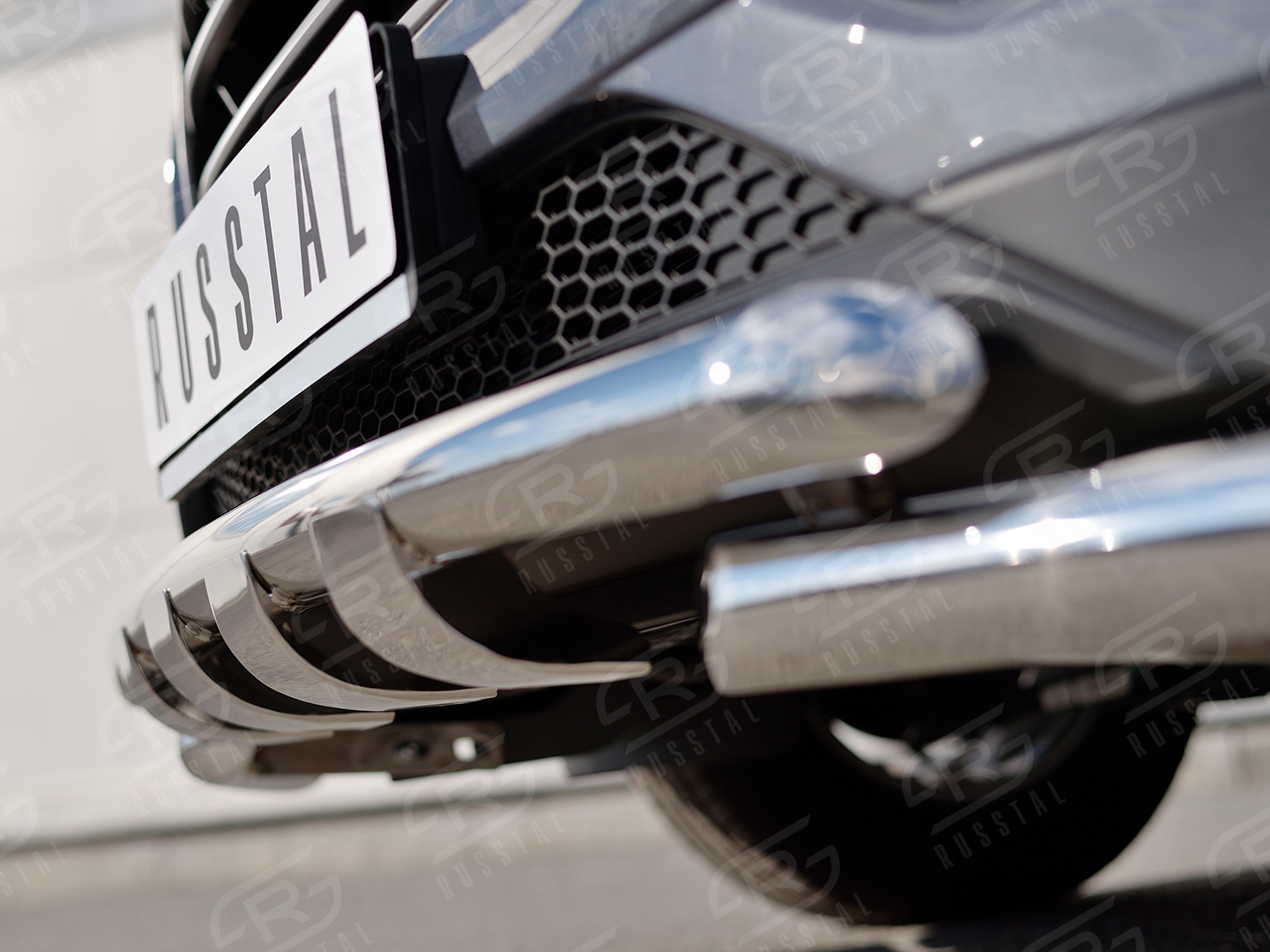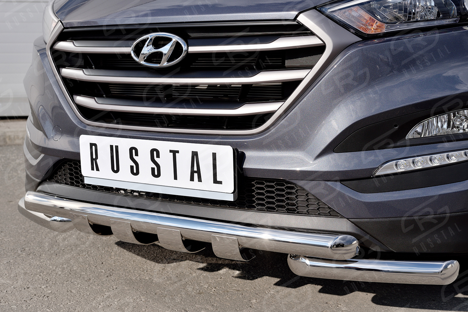 HYUNDAI Tucson 2015-2017 Защита переднего бампера Ф63 дуга-Ф63 дуга+клыки HTZ-002230 производится из итальянской нержавеющей высококачественной полированной стали марки AISI 304. Идеально подходит по заводским параметрам, и устанавливается без дополнительных изменений в кузове. Вся продукция сертифицирована. Мы производим аксессуары с 2006 года. В распоряжении компании имеются собственные производственные площадки, поэтому вся работа производится без подрядчиков и посредников.