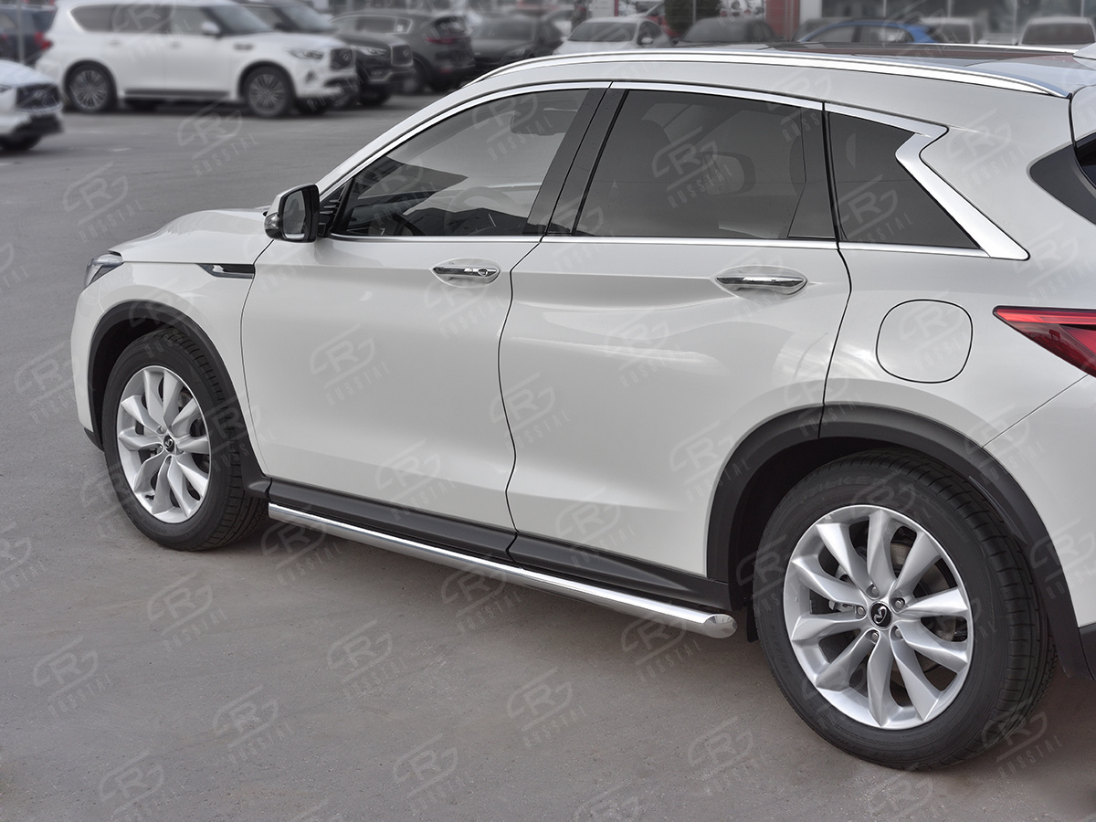 INFINITI QX50 2018- Пороги труба d63 (вариант 1) IQX5T-0030831 производится из итальянской нержавеющей высококачественной полированной стали марки AISI 304. Идеально подходит по заводским параметрам, и устанавливается без дополнительных изменений в кузове. Вся продукция сертифицирована. Мы производим аксессуары с 2006 года. В распоряжении компании имеются собственные производственные площадки, поэтому вся работа производится без подрядчиков и посредников.