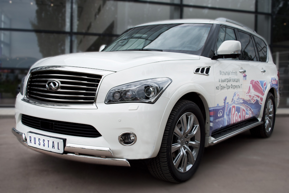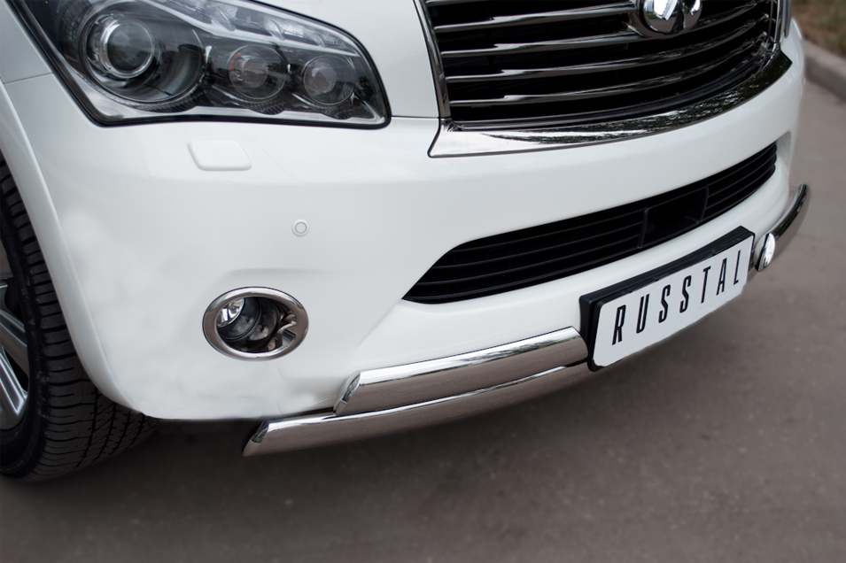 Infiniti QX 56 2010-2014 Защита переднего бампера 75х42_(75х42)х2 с подъемом INZ-000845 производится из итальянской нержавеющей высококачественной полированной стали марки AISI 304. Идеально подходит по заводским параметрам, и устанавливается без дополнительных изменений в кузове. Вся продукция сертифицирована. Мы производим аксессуары с 2006 года. В распоряжении компании имеются собственные производственные площадки, поэтому вся работа производится без подрядчиков и посредников.