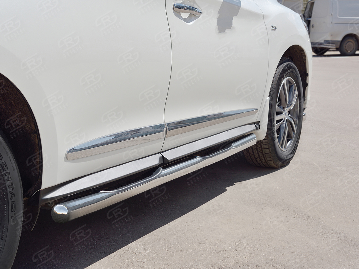 INFINITI QX60 2016- Пороги труба d76 с накладкой (вариант 3) IQXT-0026833 производится из итальянской нержавеющей высококачественной полированной стали марки AISI 304. Идеально подходит по заводским параметрам, и устанавливается без дополнительных изменений в кузове. Вся продукция сертифицирована. Мы производим аксессуары с 2006 года. В распоряжении компании имеются собственные производственные площадки, поэтому вся работа производится без подрядчиков и посредников.