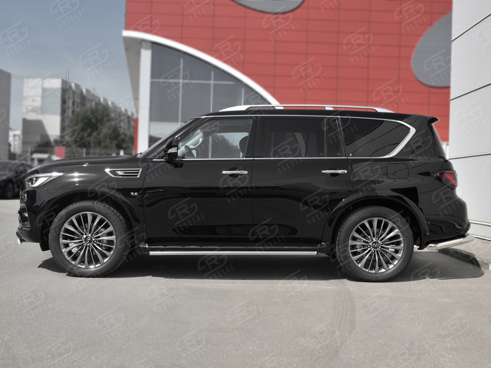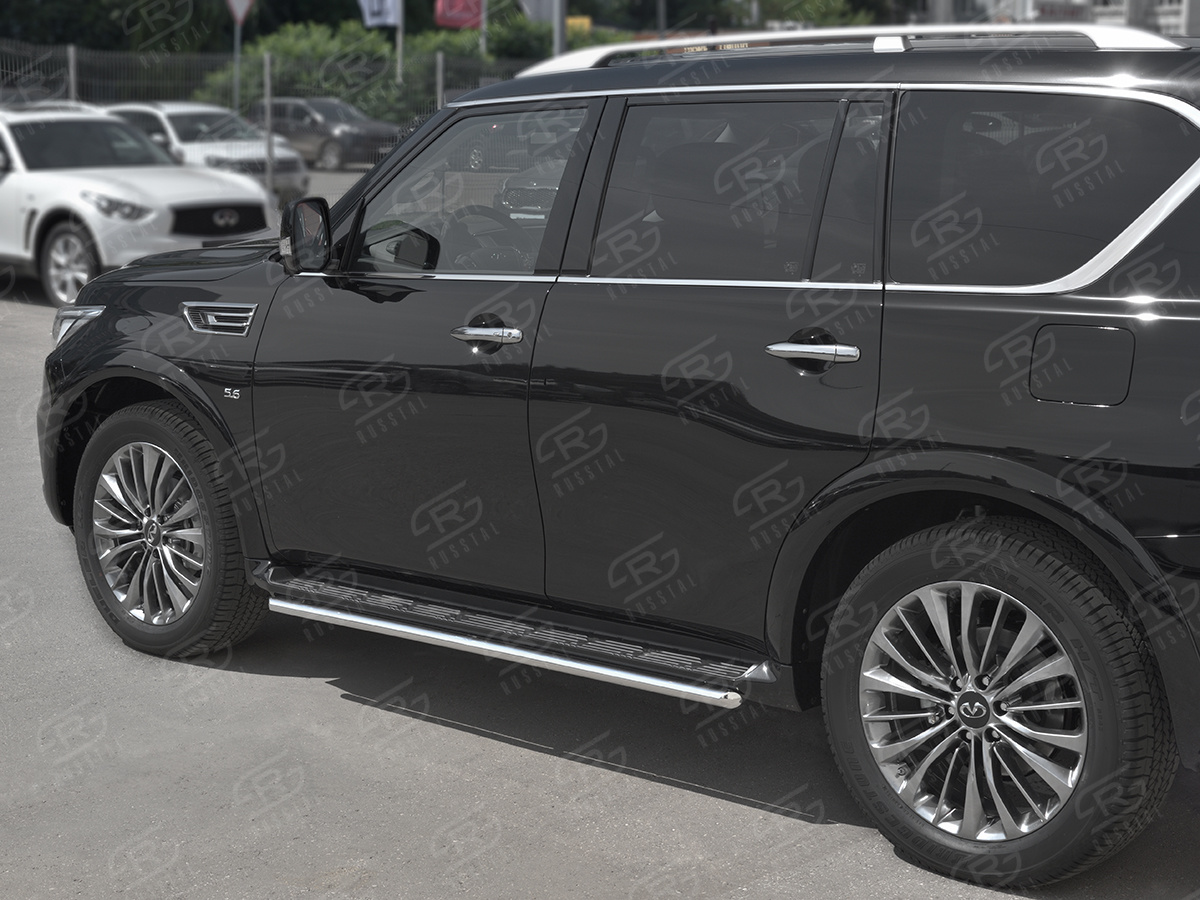 INFINITI QX80 2018- Защита порогов d42 IQX8T-003011 производится из итальянской нержавеющей высококачественной полированной стали марки AISI 304. Идеально подходит по заводским параметрам, и устанавливается без дополнительных изменений в кузове. Вся продукция сертифицирована. Мы производим аксессуары с 2006 года. В распоряжении компании имеются собственные производственные площадки, поэтому вся работа производится без подрядчиков и посредников.