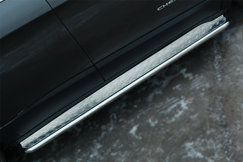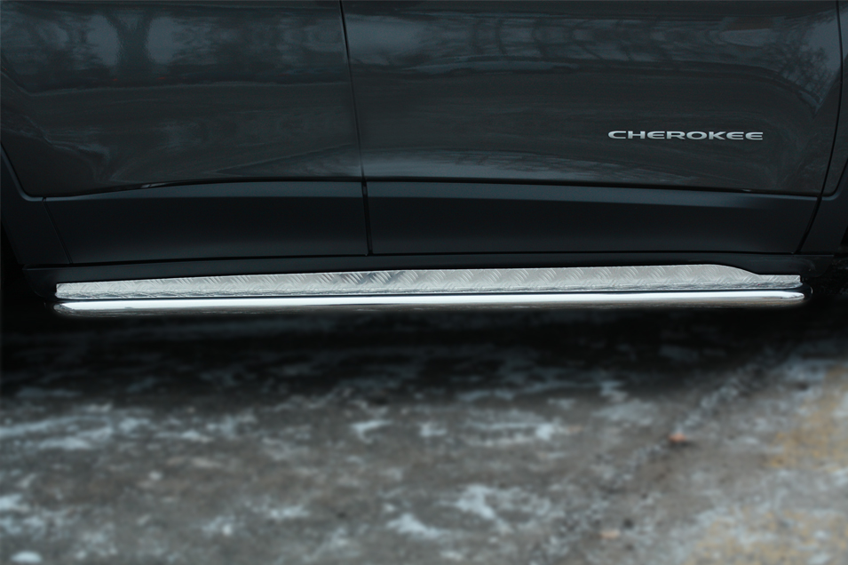 Jeep Cherokee 2014- Пороги труба d42 с листом (Лист алюм., проф. нерж) (Вариант 1) JCL-001989 производится из итальянской нержавеющей высококачественной полированной стали марки AISI 304. Идеально подходит по заводским параметрам, и устанавливается без дополнительных изменений в кузове. Вся продукция сертифицирована. Мы производим аксессуары с 2006 года. В распоряжении компании имеются собственные производственные площадки, поэтому вся работа производится без подрядчиков и посредников.