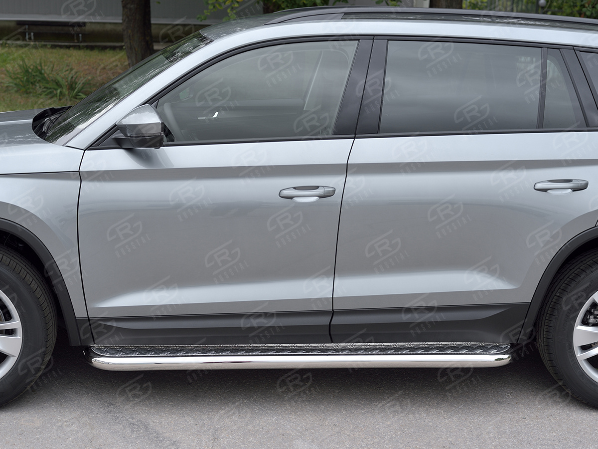 SKODA KODIAQ 2017- Пороги труба d63 с листом (Лист алюм, проф.сталь) (вариант 2) SKKL-0027742 производится из итальянской нержавеющей высококачественной полированной стали марки AISI 304. Идеально подходит по заводским параметрам, и устанавливается без дополнительных изменений в кузове. Вся продукция сертифицирована. Мы производим аксессуары с 2006 года. В распоряжении компании имеются собственные производственные площадки, поэтому вся работа производится без подрядчиков и посредников.