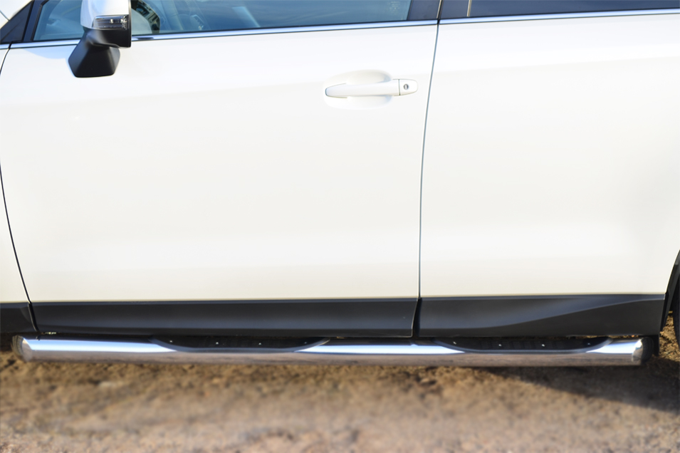 Subaru Forester 2013 Пороги труба d76 с накладкой (вариант 1) (без брызговиков) SUFT-0016001 производится из итальянской нержавеющей высококачественной полированной стали марки AISI 304. Идеально подходит по заводским параметрам, и устанавливается без дополнительных изменений в кузове. Вся продукция сертифицирована. Мы производим аксессуары с 2006 года. В распоряжении компании имеются собственные производственные площадки, поэтому вся работа производится без подрядчиков и посредников.