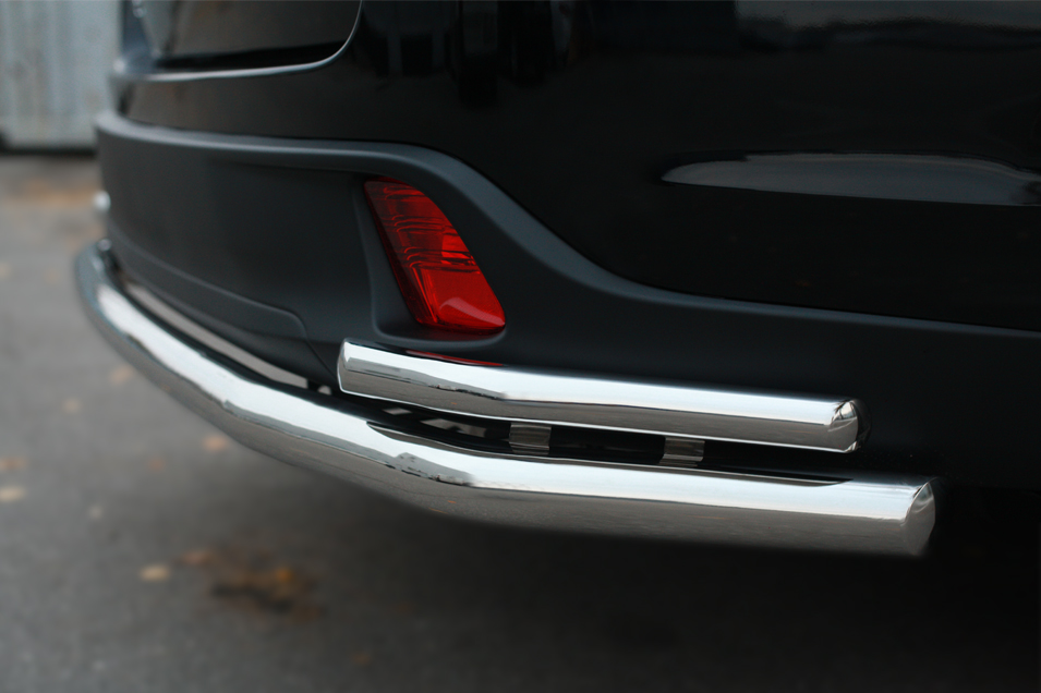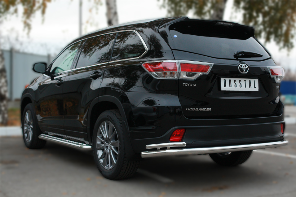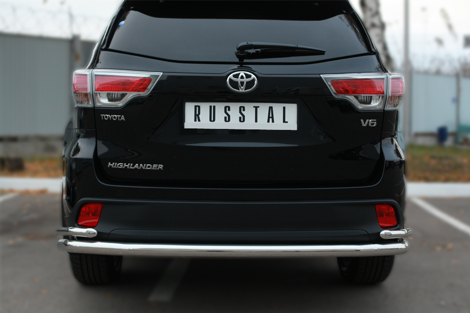 Toyota Highlander 2014-2016 Защита заднего бампера d63 (секции) d42 (уголки) THRZ-001926 производится из итальянской нержавеющей высококачественной полированной стали марки AISI 304. Идеально подходит по заводским параметрам, и устанавливается без дополнительных изменений в кузове. Вся продукция сертифицирована. Мы производим аксессуары с 2006 года. В распоряжении компании имеются собственные производственные площадки, поэтому вся работа производится без подрядчиков и посредников.