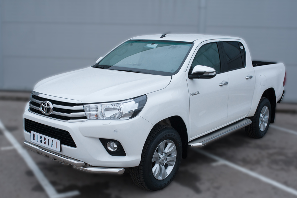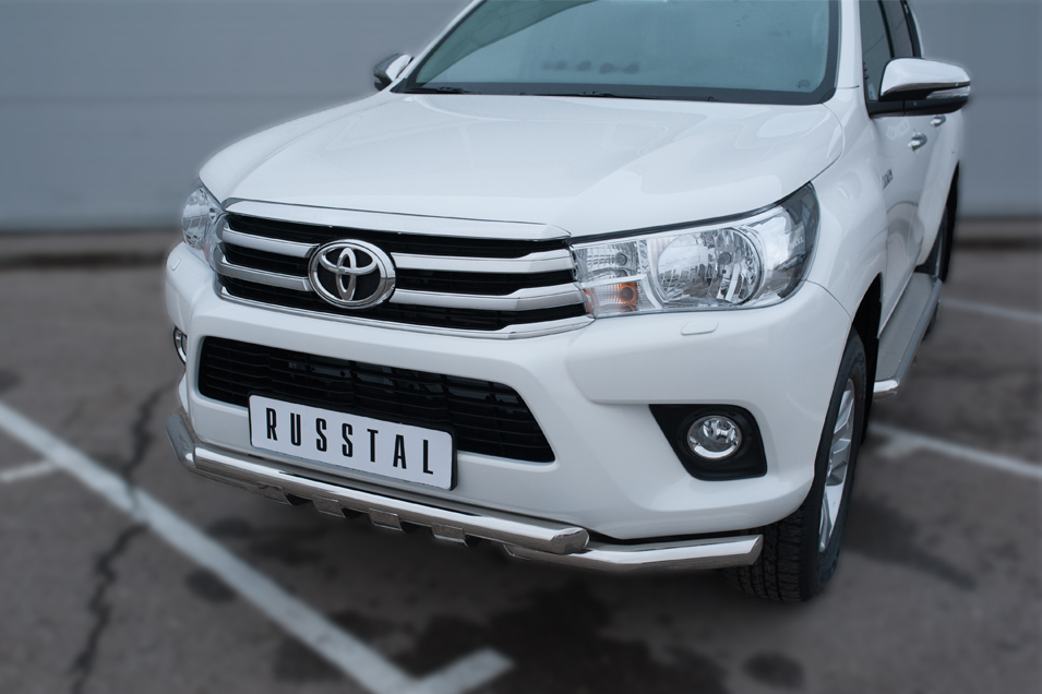 Toyota Hilux 2015 Защита переднего бампера d63 (дуга) d63 (уголки)+клыки THZ-002148 производится из итальянской нержавеющей высококачественной полированной стали марки AISI 304. Идеально подходит по заводским параметрам, и устанавливается без дополнительных изменений в кузове. Вся продукция сертифицирована. Мы производим аксессуары с 2006 года. В распоряжении компании имеются собственные производственные площадки, поэтому вся работа производится без подрядчиков и посредников.