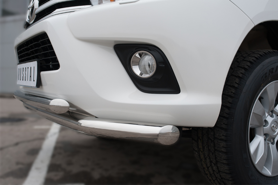Toyota Hilux 2015 Защита переднего бампера d76 (секции) d63 (дуга) THZ-002147 производится из итальянской нержавеющей высококачественной полированной стали марки AISI 304. Идеально подходит по заводским параметрам, и устанавливается без дополнительных изменений в кузове. Вся продукция сертифицирована. Мы производим аксессуары с 2006 года. В распоряжении компании имеются собственные производственные площадки, поэтому вся работа производится без подрядчиков и посредников.