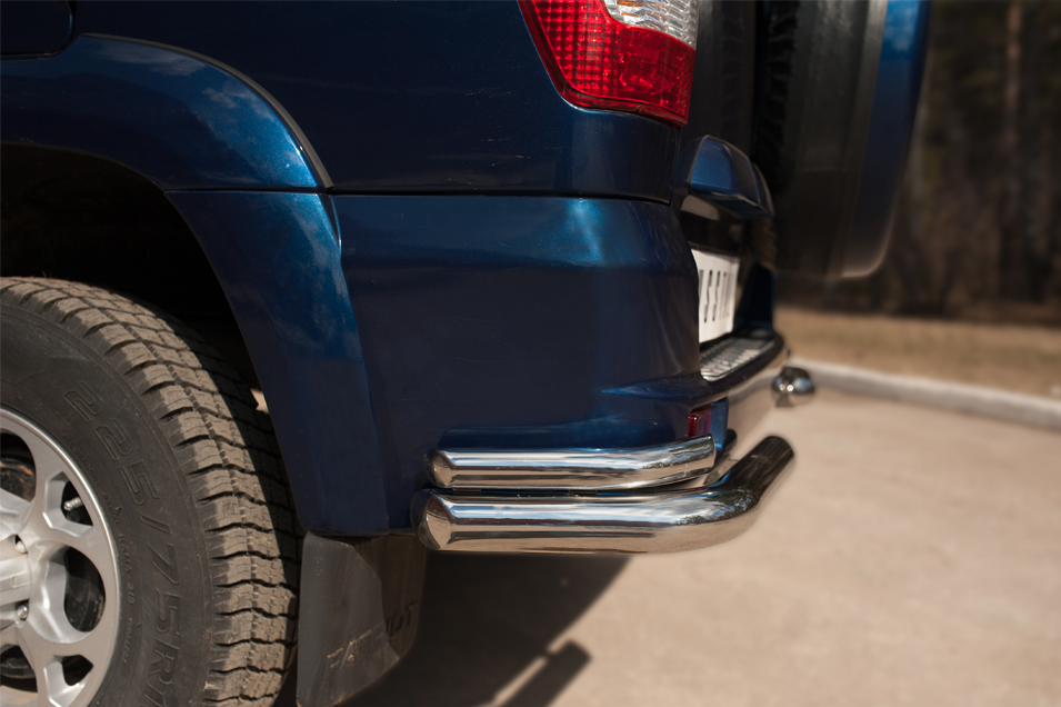 Uaz Patriot 2014 Защита заднего бампера уголки d63 (секции) d42 (секции) UPZ-002072 производится из итальянской нержавеющей высококачественной полированной стали марки AISI 304. Идеально подходит по заводским параметрам, и устанавливается без дополнительных изменений в кузове. Вся продукция сертифицирована. Мы производим аксессуары с 2006 года. В распоряжении компании имеются собственные производственные площадки, поэтому вся работа производится без подрядчиков и посредников.