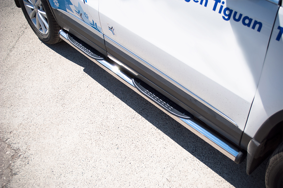 VolksWagen Tiguan Sport & Style 2011-2016 пороги труба d76 с накладками (вариант 2) VGT-0009922 производится из итальянской нержавеющей высококачественной полированной стали марки AISI 304. Идеально подходит по заводским параметрам, и устанавливается без дополнительных изменений в кузове. Вся продукция сертифицирована. Мы производим аксессуары с 2006 года. В распоряжении компании имеются собственные производственные площадки, поэтому вся работа производится без подрядчиков и посредников.