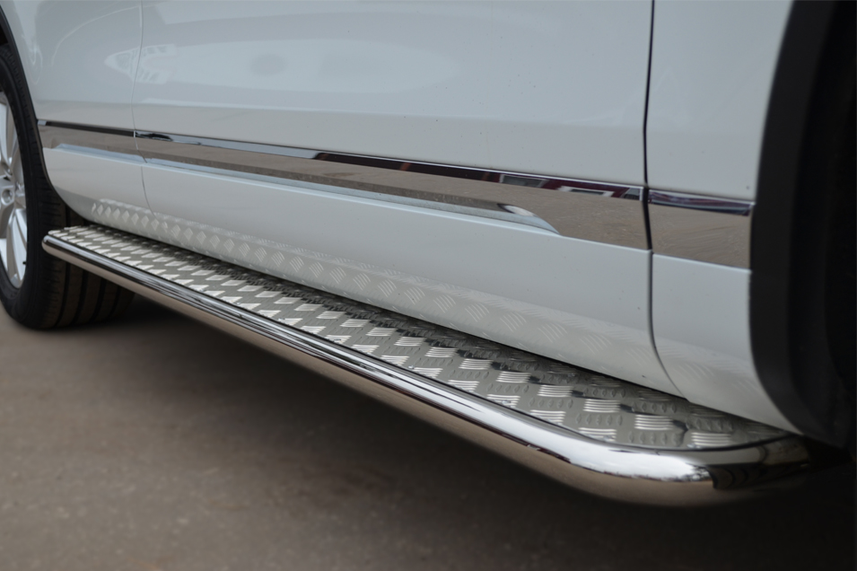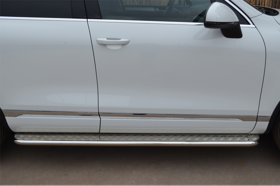 VolksWagen Touareg 2010-2013 Пороги труба d42 с листом (Лист алюм,проф.нерж)(Вариант1) VTT-001070 производится из итальянской нержавеющей высококачественной полированной стали марки AISI 304. Идеально подходит по заводским параметрам, и устанавливается без дополнительных изменений в кузове. Вся продукция сертифицирована. Мы производим аксессуары с 2006 года. В распоряжении компании имеются собственные производственные площадки, поэтому вся работа производится без подрядчиков и посредников.