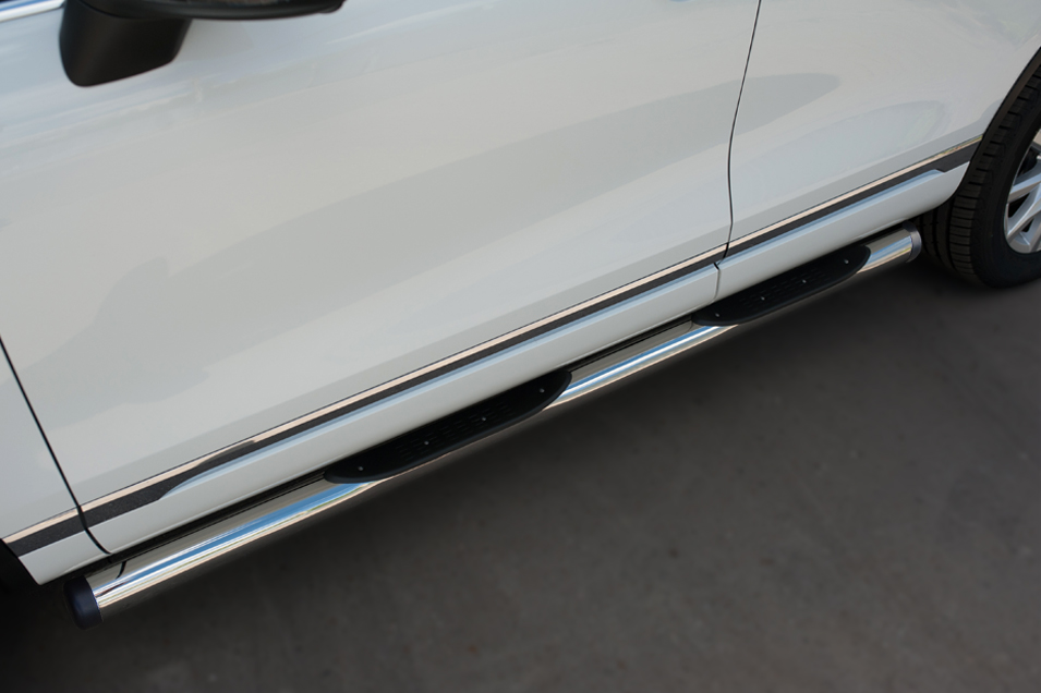 VolksWagen Touareg 2014- Пороги труба d76 с накладкой (вариант 2) VWTT-0021282 производится из итальянской нержавеющей высококачественной полированной стали марки AISI 304. Идеально подходит по заводским параметрам, и устанавливается без дополнительных изменений в кузове. Вся продукция сертифицирована. Мы производим аксессуары с 2006 года. В распоряжении компании имеются собственные производственные площадки, поэтому вся работа производится без подрядчиков и посредников.