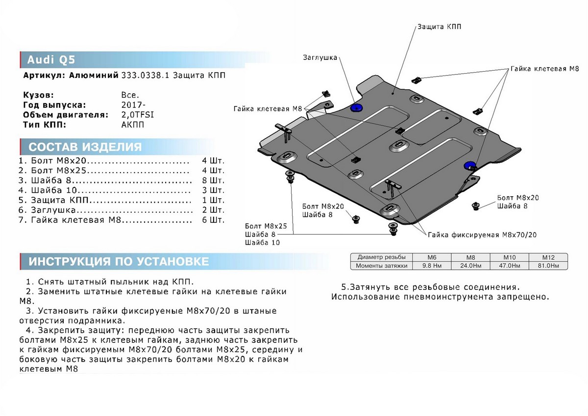 Обращаем ваше внимание, на тот факт, что защита имеет форму, соответствующую модели данного автомобиля. Наличие глубокого штампа и лючков для смены фильтров/масла предусмотрено не на всех защитах. Фото служит для визуального восприятия товара.