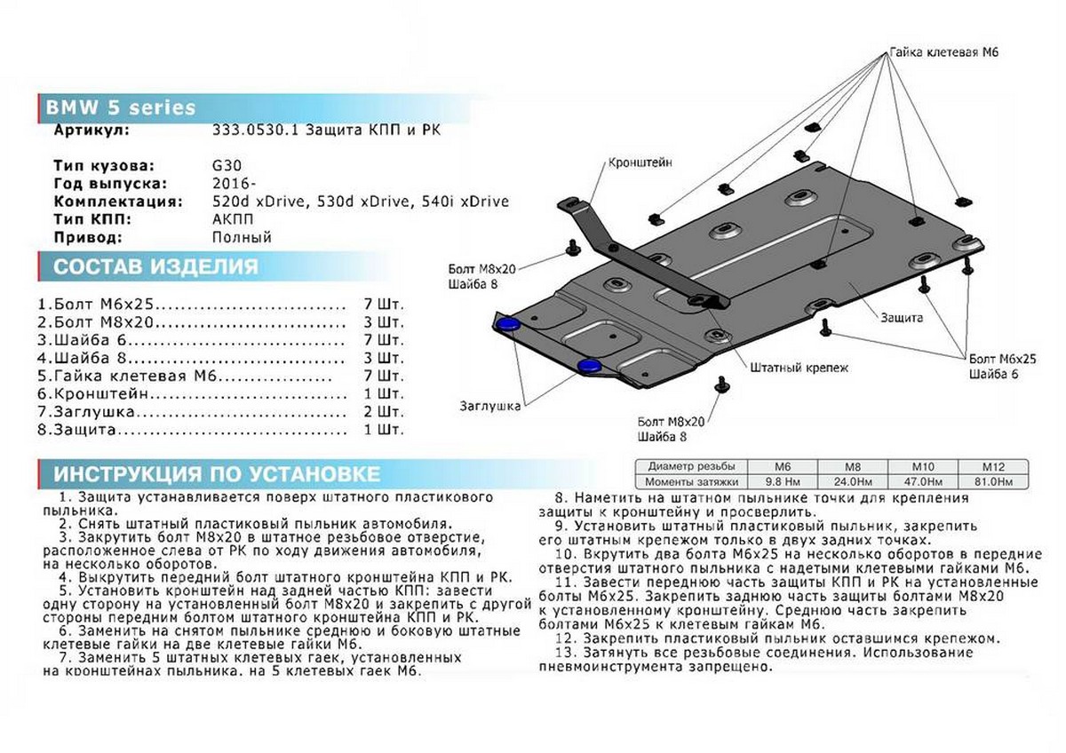 Защита КПП и РК Rival для BMW 5-series (V - 520d; 530d; 540i) 4WD 2016-н.в., алюминий 4 мм, с крепежом, 333.0530.1