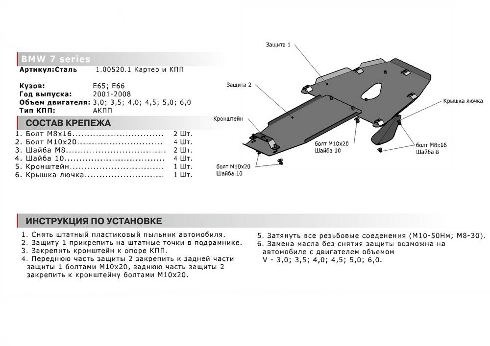 В нашем интернет-магазине можно купить Защиту картера и КПП Автоброня для BMW 7 серия E65, E66; (2 части) V - 3,0; 3,5; 4,0; 4,5; 5,0; 6,0 2001-2008
