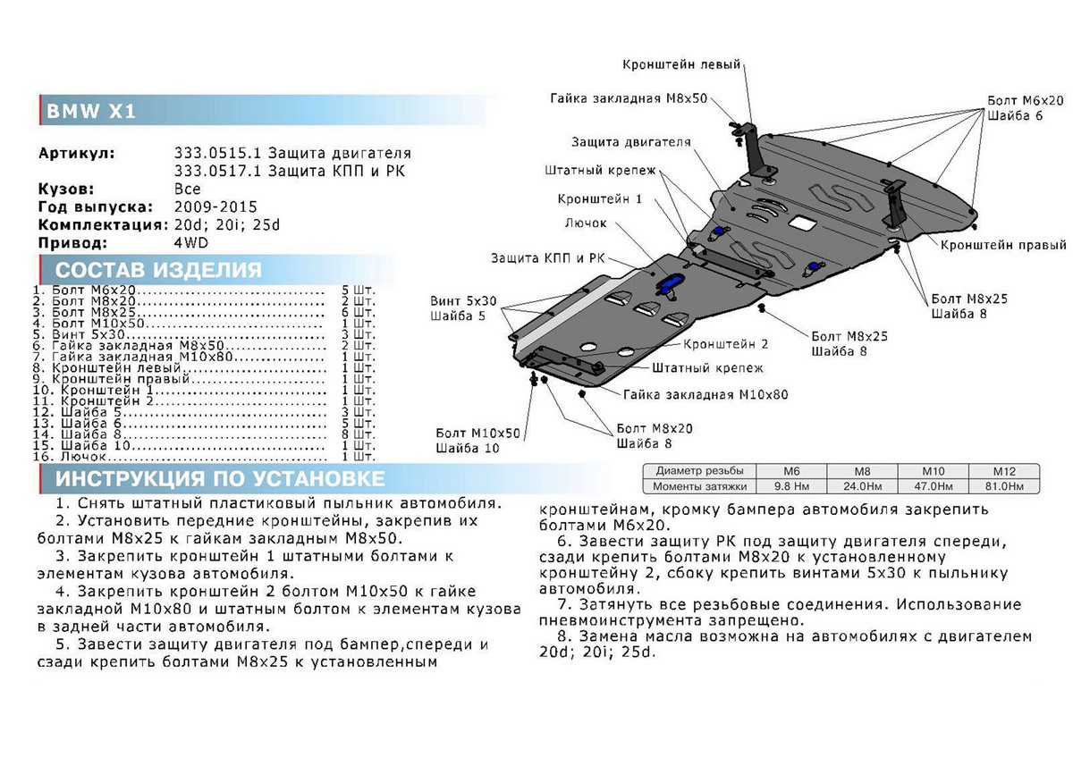 Защита КПП и РК Rival для BMW X1 (V - 20i; 20d; 25d) 4WD 2009-2015, алюминий 4 мм, с крепежом, 333.0517.1