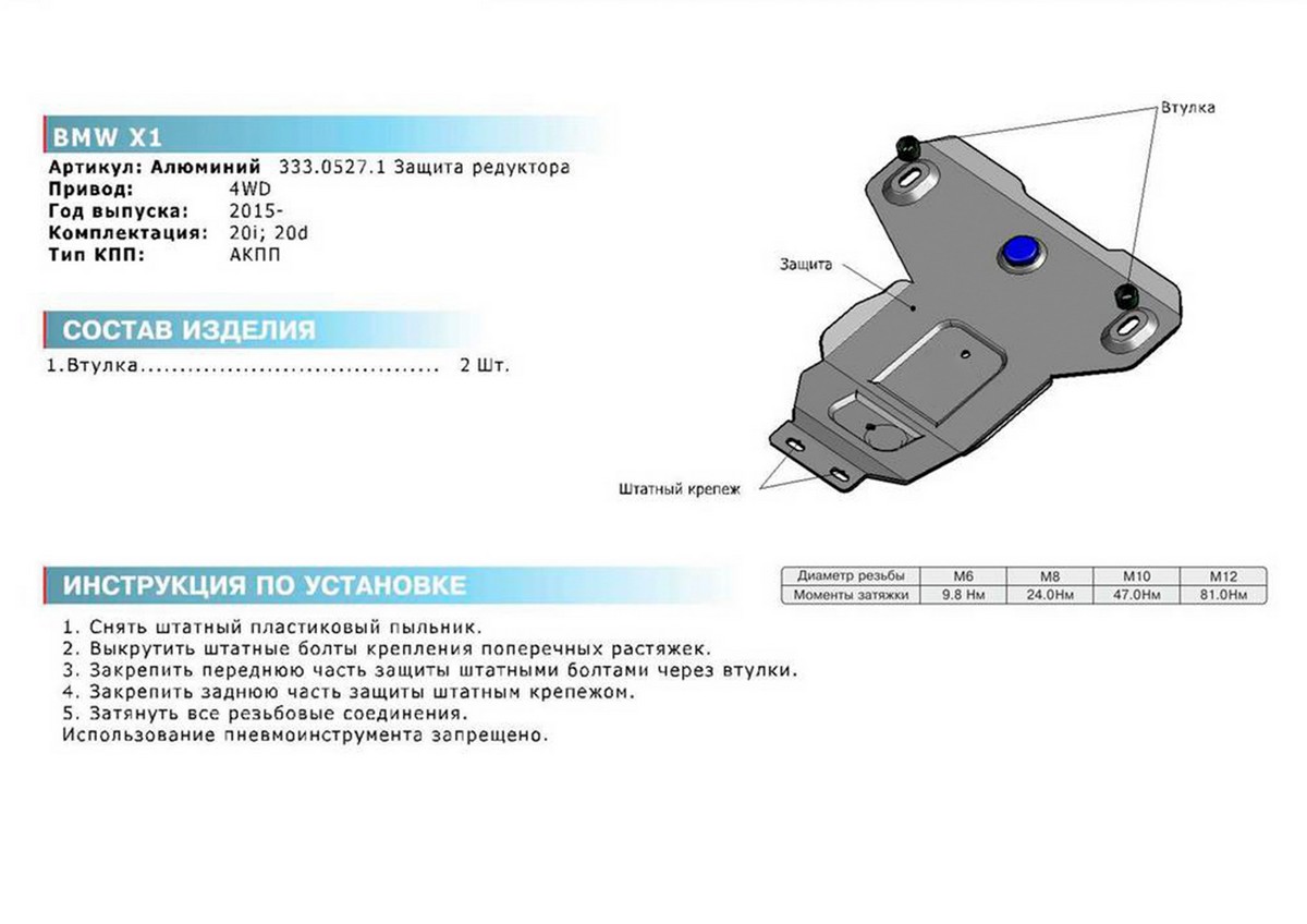 Защита редуктора Rival для BMW X1 (V - 20i; 20d) 4WD 2015-н.в., алюминий 4 мм, с крепежом, 333.0527.1