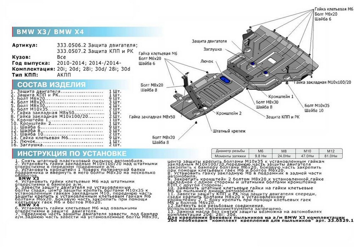 Защита картера Rival для BMW X3 (V - 20i; 20d; 28i; 30d) 2010-2014/BMW X3 (V - 20i; 20d; 28i; 30d) 2014-2017/BMW X4 (V - 28i; 30d) 2014-н.в., алюминий 4 мм, с крепежом, 333.0506.2
