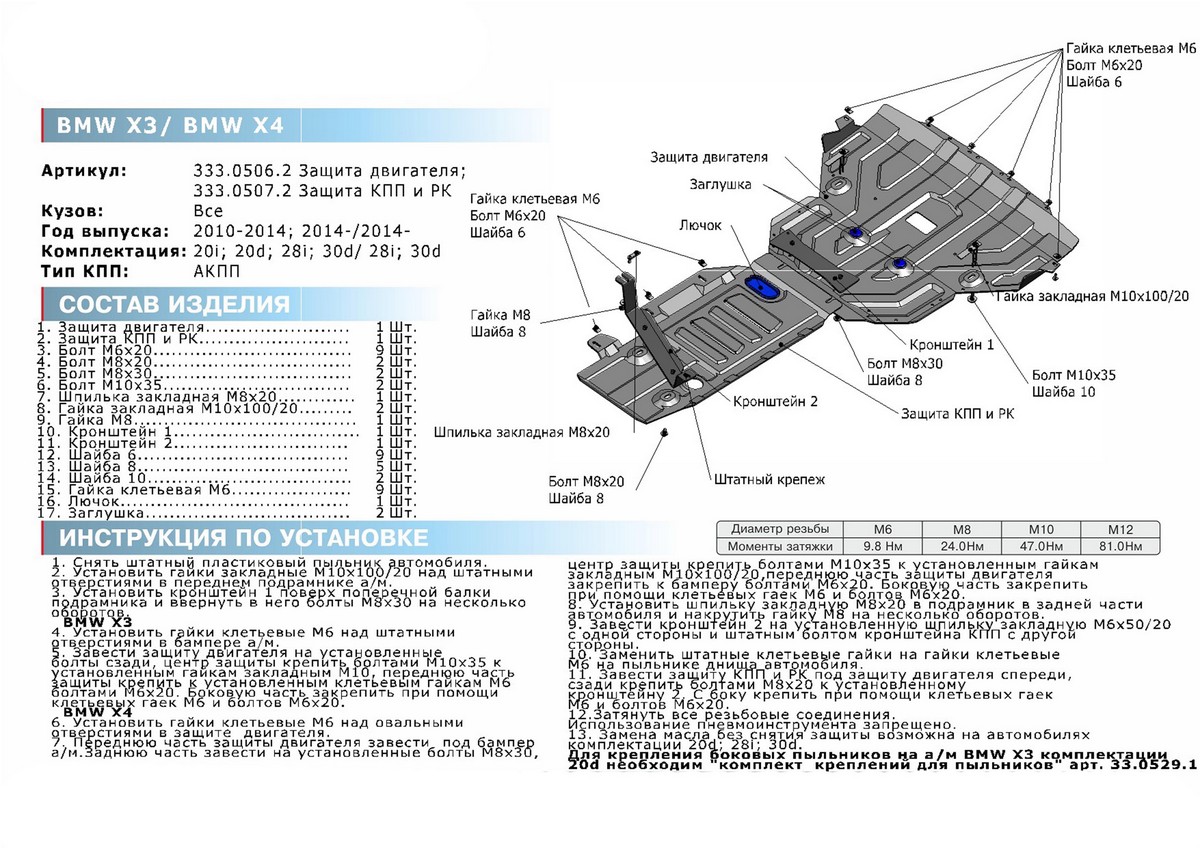 Защита КПП и РК Rival для BMW X3 (V - 20i; 20d; 28i; 30d) 2010-2014/BMW X3 (V - 20i; 20d; 28i; 30d) 2014-2017/BMW X4 (V - 28i; 30d) 2014-н.в., алюминий 4 мм, с крепежом, 333.0507.2