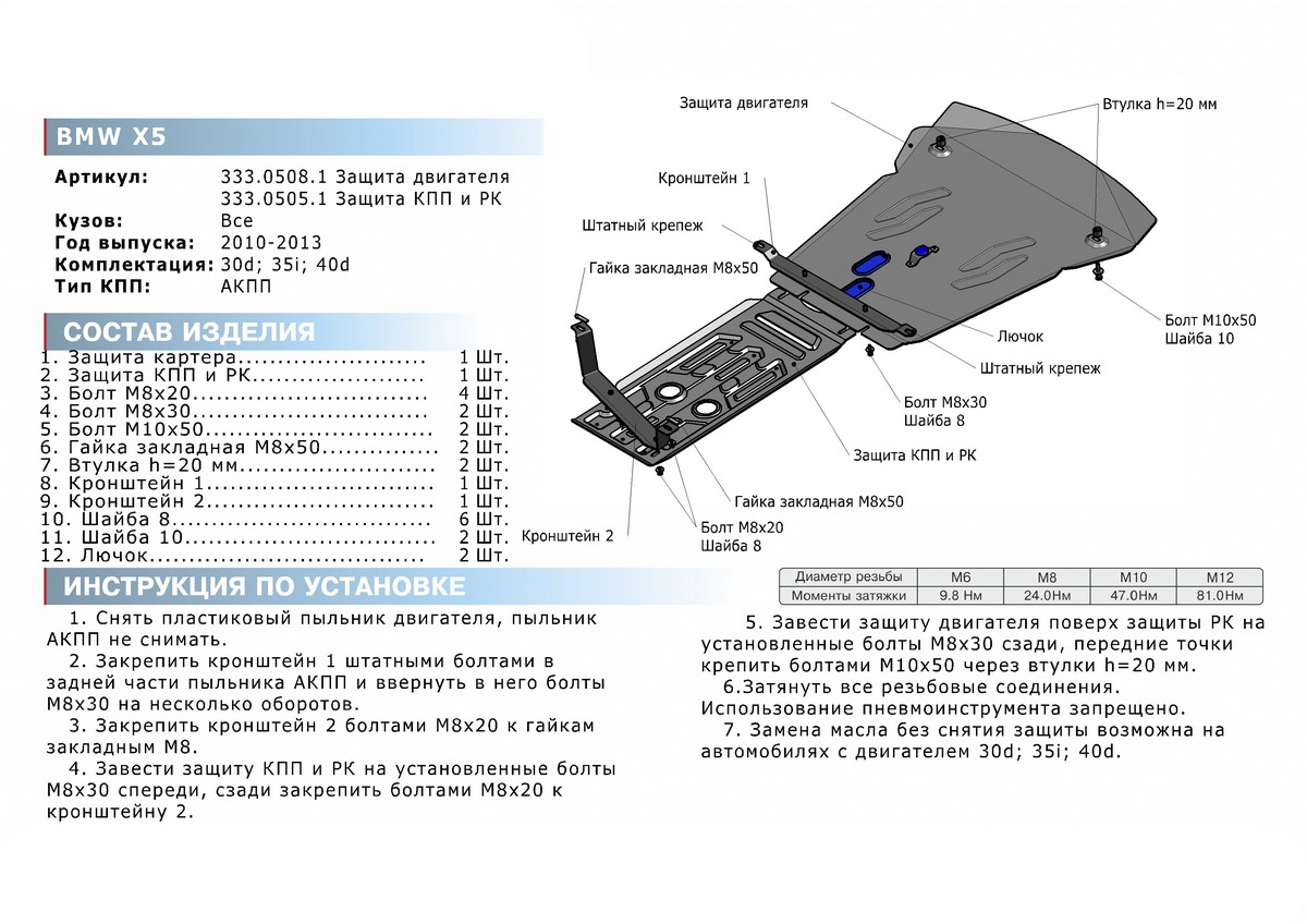 Защита картера Rival для BMW X5 (V - 30d; 35i; 40d) 2010-2013, алюминий 4 мм, с крепежом, 333.0508.1