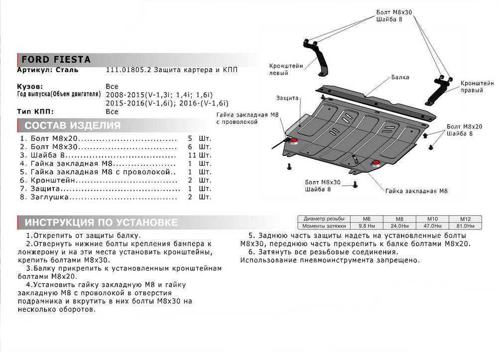 В нашем интернет-магазине можно купить Защиту картера и КПП Автоброня для Ford Fiesta, V -1,3; 1,4; 1,6 2008-2015 2015-2016