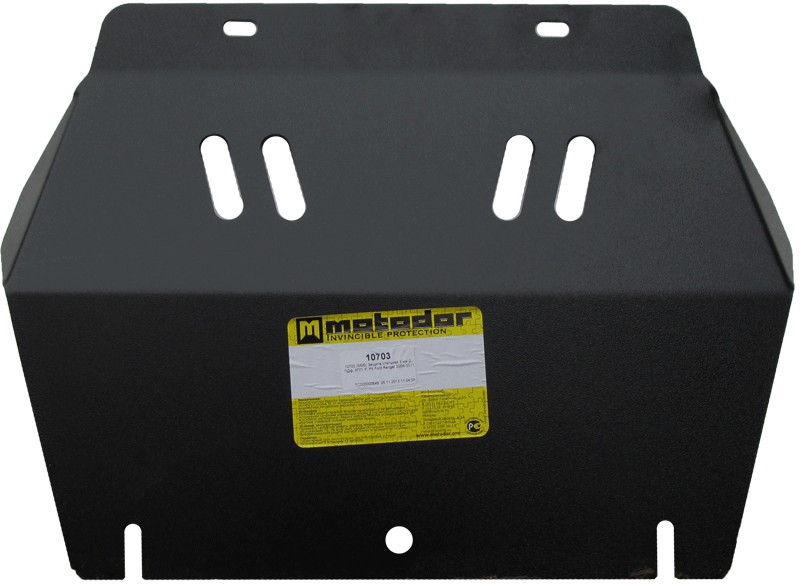 Защита двигателя Motodor для машины Ford Ranger (2006-2012) произведена из качественной горячекатаной стали марки СТ3 толщиной два миллиметра. Защита картера имеет ребра жесткости и вентиляционные отверстия, позволяющие соблюдать температурный режим. В некоторых вариантах защиты предусмотрены отверстия для слива масла и замены фильтров, но при тех.обслуживании рекомендуется снимать защиту картера полностью для осмотра двигателя.
