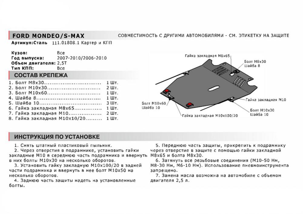 В нашем интернет-магазине можно купить Защиту картера и КПП Автоброня для Ford S-Max, V - 2,5Т 2006-2010