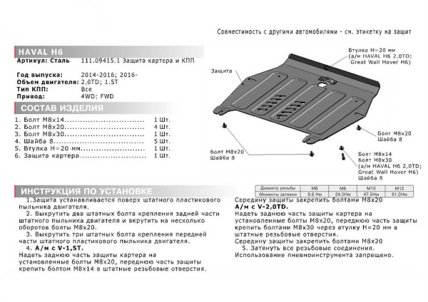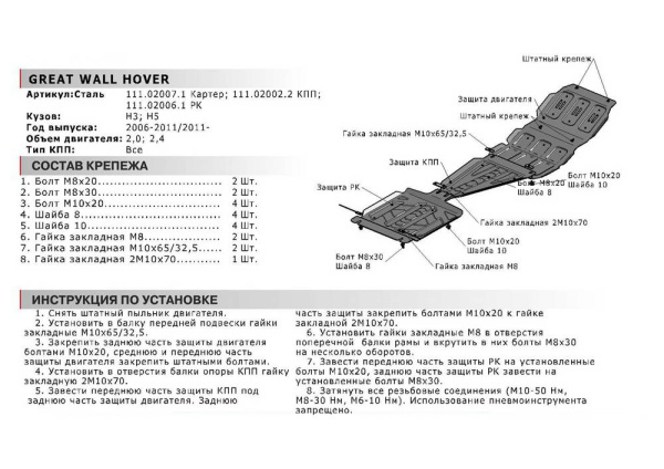 Защита двигателя легко крепится на любую модель Great Wall, т.к. При изготовлении принимается во внимание индивидуальность каждой модели. Крепится защита картера двигателя взамен штатного пластикового пыльника - для крепления дополнительных отверстий не потребуется. По цене защита двигателя для Great Wall существенно дешевле, чем ремонт картера. По этой причине купить защиту картера двигателя для любой модели Great Wall рекомендовано каждому.
