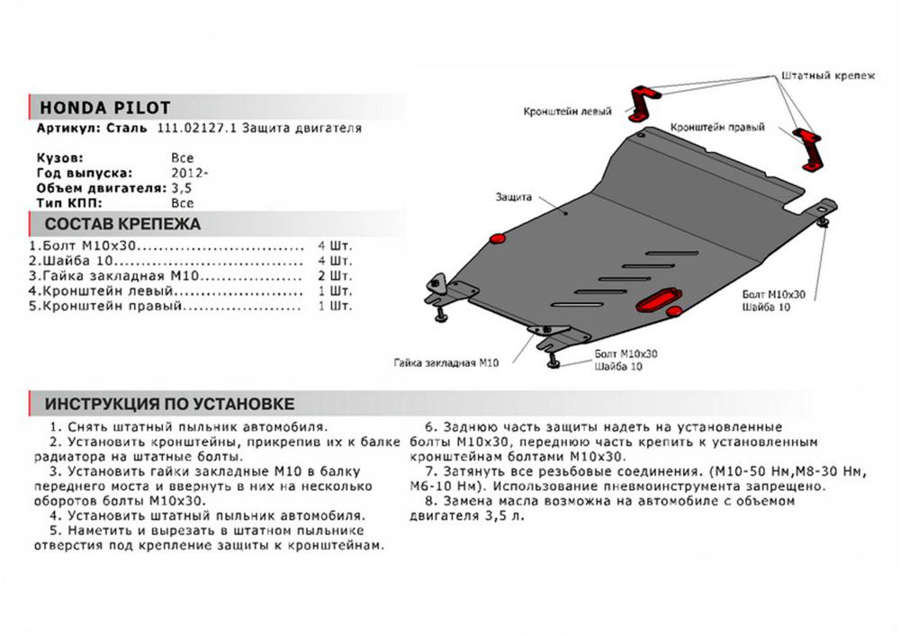 В нашем интернет-магазине можно купить Защиту картера и КПП Автоброня для Honda Pilot, V - 3,5 2012-