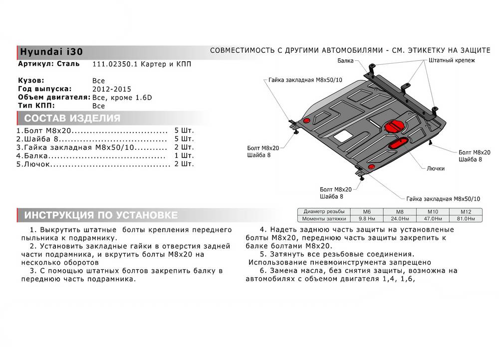 Обращаем ваше внимание, на тот факт, что защита имеет форму, соответствующую модели данного автомобиля. Наличие глубокого штампа и лючков для смены фильтров/масла предусмотрено не на всех защитах. Фото служит для визуального восприятия товара.