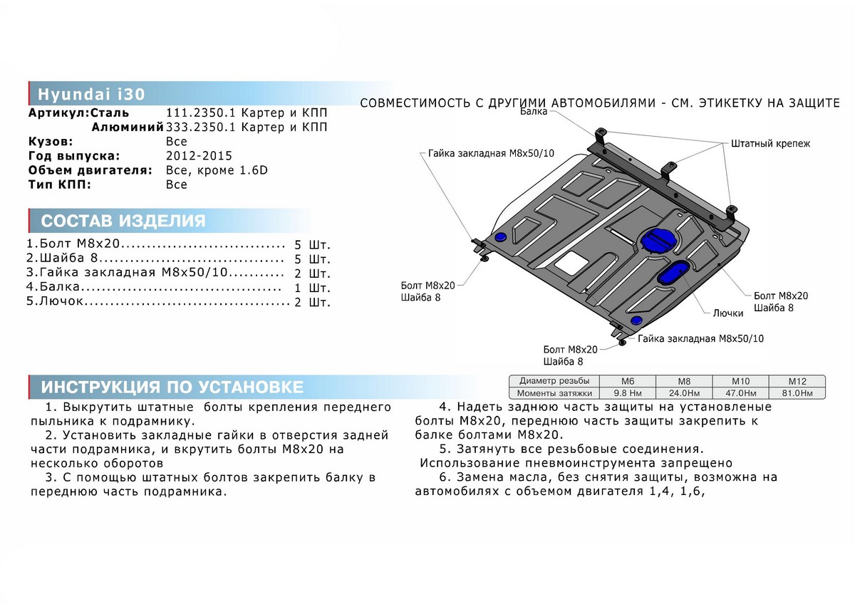Защита картера и КПП Rival для Hyundai i30 (V - кроме 1.6d) 2012-2015/Kia Ceed хэтчбек 5-дв. (V - 1.4; 1.6) 2012-2015/Kia Ceed универсал (V - 1.6) 2012-2015/Kia Ceed GT хэтчбек 5-дв. (V - 1.6T) 2012-2015/Kia Ceed GT хэтчбек 5-дв. (V - 1.6T) 2015-н.в./Kia Cerato (V - 1.6; 2.0) 2013-2015/Kia Pro Ceed хэтчбек 3-дв. (V - 1.6) 2012-2015/Kia Pro Ceed GT хэтчбек 3-дв. (V - 1.6T) 2012-2015/Kia Pro Ceed GT хэтчбек 3-дв. (V - 1.6T) 2015-н.в., алюминий 4 мм, с крепежом, 333.2350.1