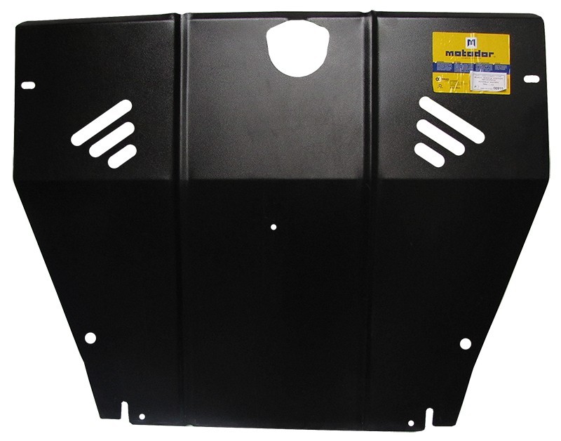 Защита двигателя Motodor для машины Hyundai Matrix (2001-2010) произведена из качественной горячекатаной стали марки СТ3 толщиной два миллиметра. Защита картера имеет ребра жесткости и вентиляционные отверстия, позволяющие соблюдать температурный режим. В некоторых вариантах защиты предусмотрены отверстия для слива масла и замены фильтров, но при тех.обслуживании рекомендуется снимать защиту картера полностью для осмотра двигателя.