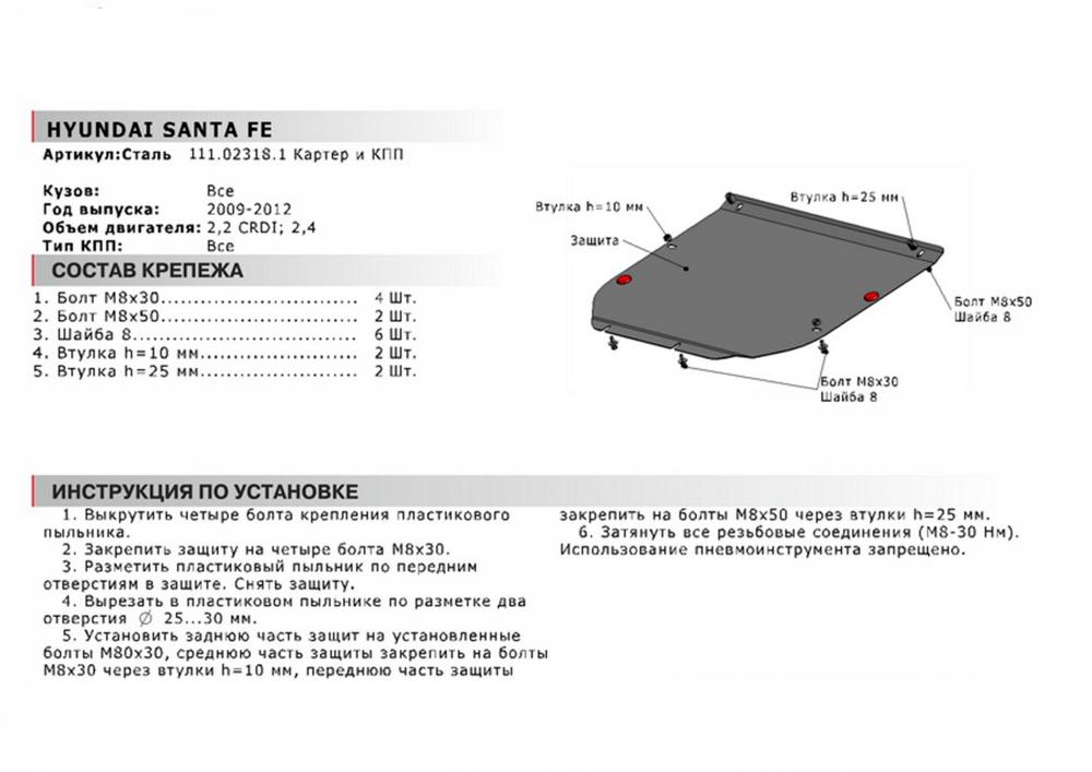 В нашем интернет-магазине можно купить Защиту картера и КПП Автоброня для Hyundai Santa Fe, V - 2,4; 2,2 CRDI 2009-2012