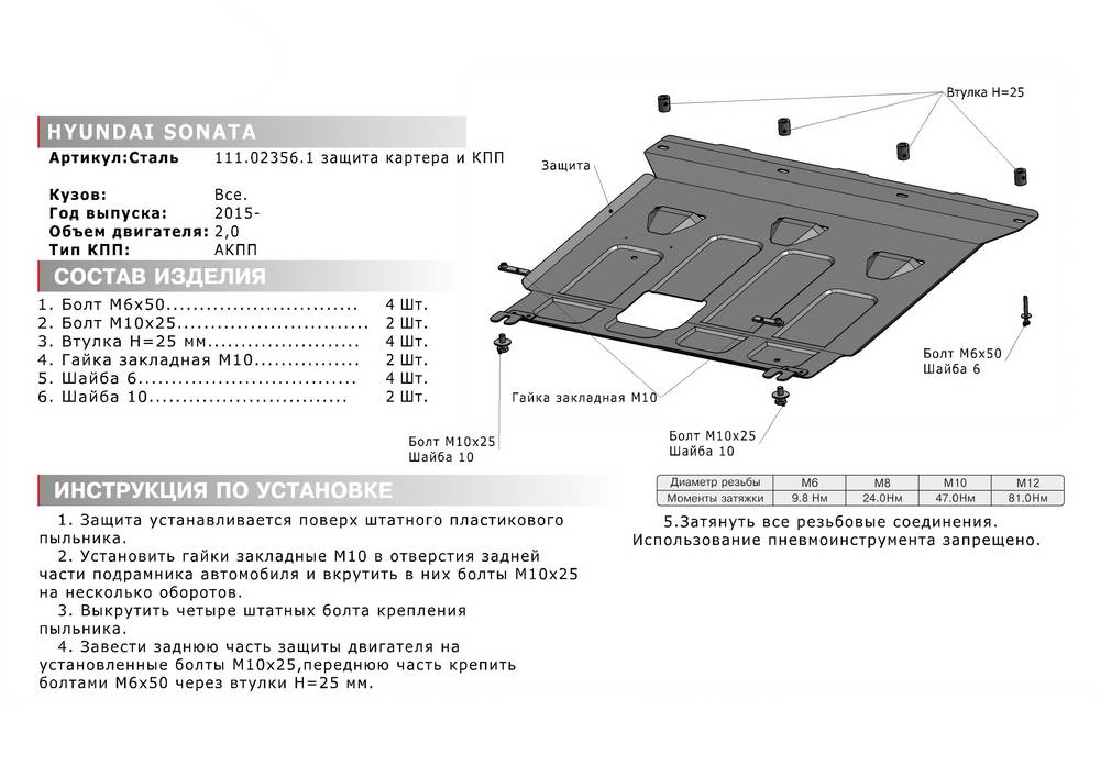 В нашем интернет-магазине можно купить Защиту картера и КПП Автоброня для Hyundai Sonata, V-2,0 АКПП 2015-
