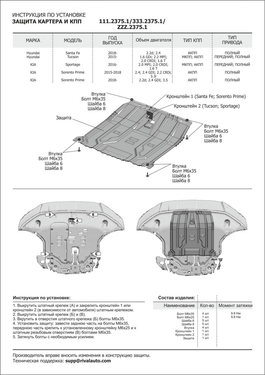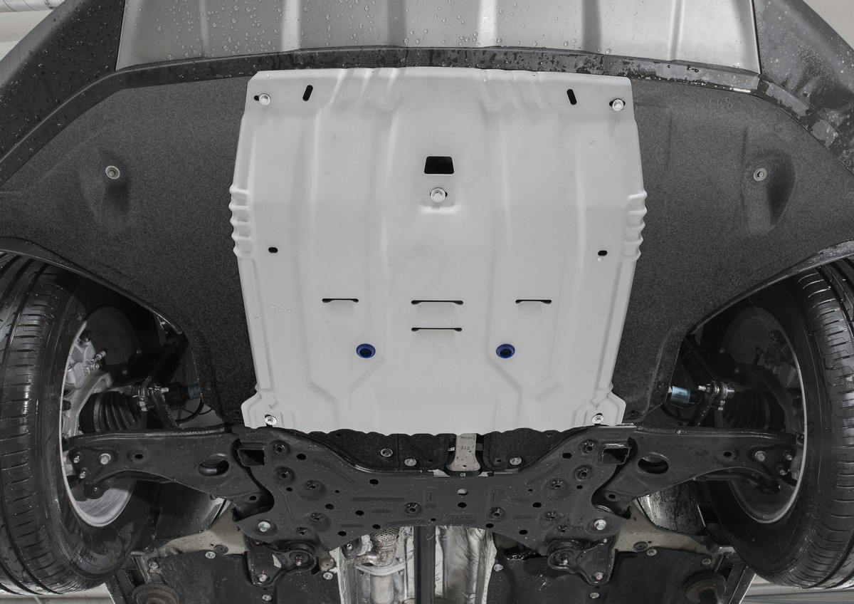 Защита картера и КПП Rival для Hyundai Santa Fe IV (V - 2.2d; 2.4) 2018-н.в./Hyundai Tucson III (V - 1.6; 1.6T (177 л.с.); 2.0; 2.0d) 2015-2018/Hyundai Tucson III рестайлинг (V - 1.6T GDI (177л.с.); 2.0d) 2018-н.в./Kia Sorento Prime III (V - 2.4; 2.2d; 3.3) 2015-2017/Kia Sorento Prime III рестайлинг (V - 2.2d; 2.4) 2018-н.в./Kia Sportage IV (V - 1.6T (177 л.с.); 2.0; 2.0d) 2016-2018/Kia Sportage IV рестайлинг (V - 2.0; 2.0d; 2.4) 2018-н.в., алюминий 4 мм, с крепежом, 333.2375.1