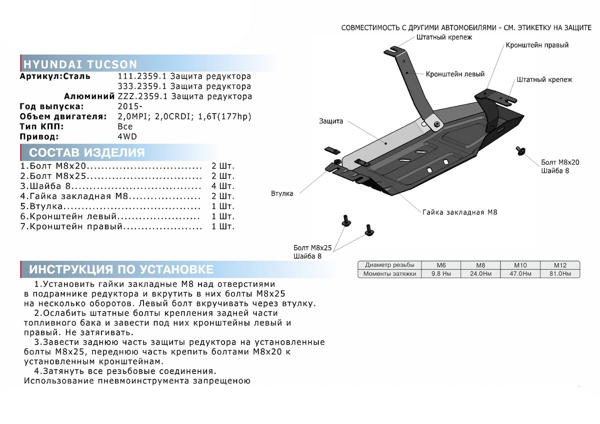 Защита редуктора Rival для Hyundai Tucson (V - 1.6T (177 л.с.); 2.0; 2.0d) 4WD 2015-2018/Hyundai Tucson (V - 2.0d) 4WD 2018-н.в./Kia Sportage (V - 1.6T (177 л.с.); 2.0; 2.0d) 4WD 2016-н.в., алюминий 4 мм, с крепежом, 333.2359.1