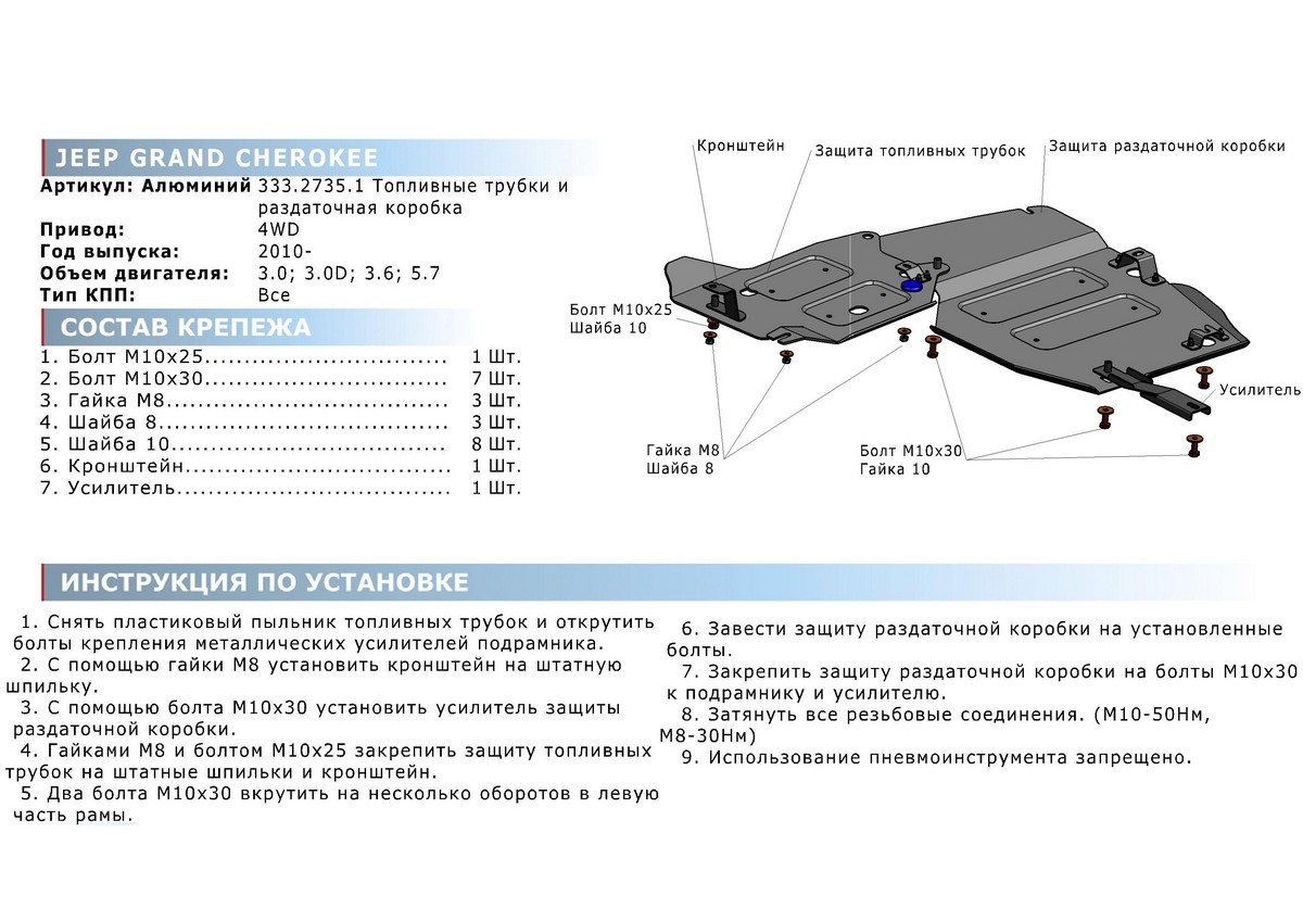 Защита РК и топливных трубок Rival для Jeep Grand Cherokee (V - 3.0; 3.0d; 3.6; 5.7) 2010-2014/Jeep Grand Cherokee (V - 3.0; 3.0d; 3.6; 5.7) 2014-2018/Jeep Grand Cherokee (V - 3.6) 2018-н.в., алюминий 4 мм, с крепежом, 333.2735.1