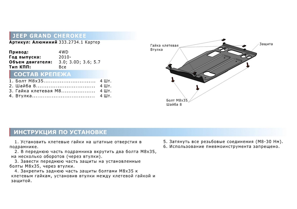 Защита картера Rival для Jeep Grand Cherokee (V - 3.0; 3.0d; 3.6; 5.7) 2010-2014/Jeep Grand Cherokee (V - 3.0; 3.0d; 3.6; 5.7) 2014-2018/Jeep Grand Cherokee (V - 3.6) 2018-н.в., алюминий 4 мм, с крепежом, 333.2734.1