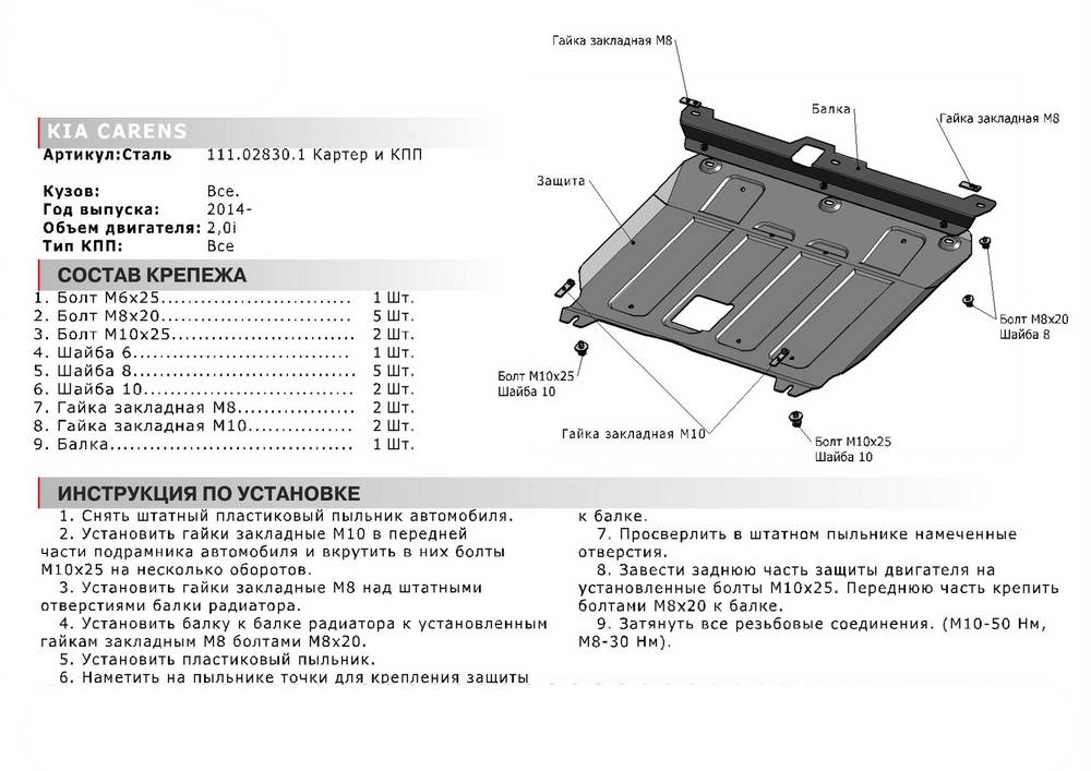 Обращаем ваше внимание, на тот факт, что защита имеет форму, соответствующую модели данного автомобиля. Наличие глубокого штампа и лючков для смены фильтров/масла предусмотрено не на всех защитах. Фото служит для визуального восприятия товара.