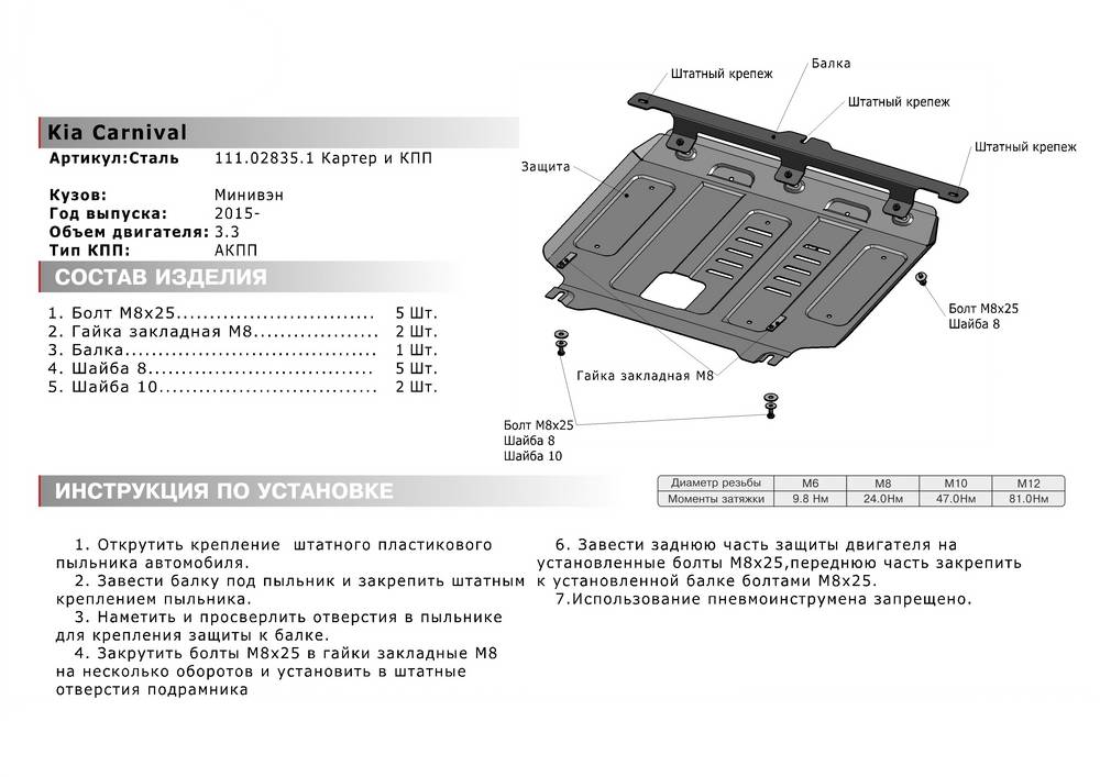 В нашем интернет-магазине можно купить Защиту картера и КПП Автоброня для Kia Carnival, V - 3,3 АКП 2015-