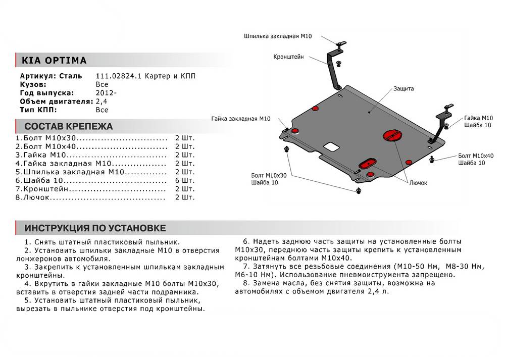 В нашем интернет-магазине можно купить Защиту картера и КПП Автоброня для Kia Optima, V - 2,4 2012-2016
