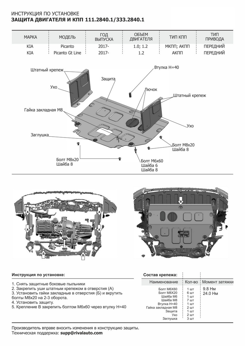 Защита картера и КПП Rival для Kia Picanto (V - 1.2 Gtline; 1.0) 2017-н.в., алюминий 4 мм, с крепежом, 333.2840.1