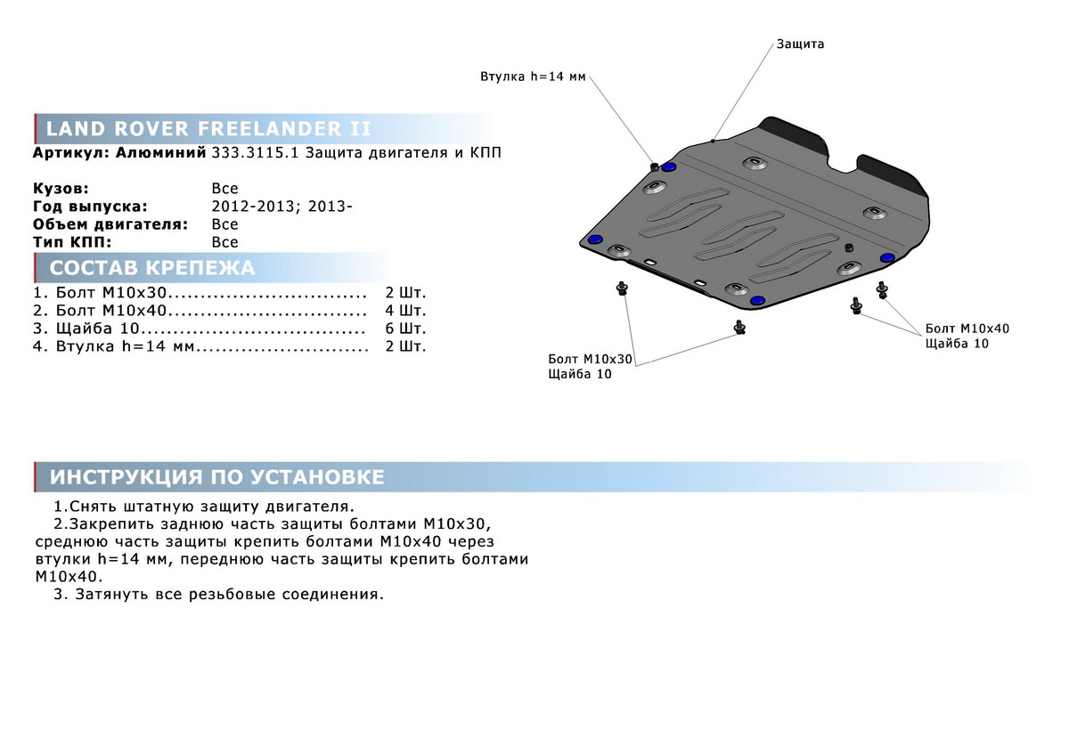 Защита картера и КПП Rival для Land Rover Freelander 2 (V - все) 2012-2015, алюминий 4 мм, с крепежом, 333.3115.1