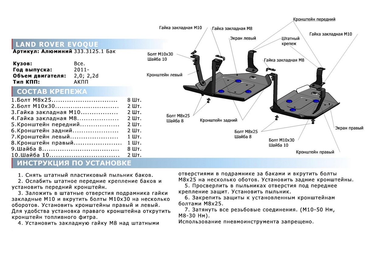 Защита топливного бака Rival для Land Rover Range Rover Evoque (V - 2.0; 2.2d) 2011-н.в., алюминий 4 мм, с крепежом, 333.3125.1