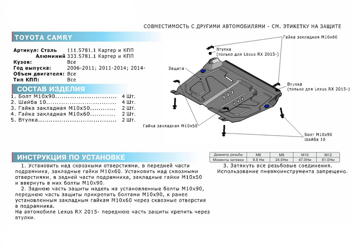 Защита картера и КПП Rival (увеличенная) для Lexus ES (V - 2.5; 3.5) 2012-2015/Lexus ES (V - 2.5; 3.5) 2015-2018/Lexus RX 270/350 (V - все) 2008-2015/Lexus RX 350/200t/450h (V - все) 2015-н.в./Lifan Murman (V - 1.8) МКПП 2017-н.в./Toyota Camry (V - 2.4; 3.5) 2006-2011/Toyota Camry (V - 2.0; 2.5; 3.5) 2011-2014/Toyota Camry (V - 2.0; 2.5; 3.5) 2014-2018/Toyota Highlander (V - 3.5) 2010-2014/Toyota Highlander (V - 3.5) 2014-2017/Toyota Highlander (V - 3.5) 2017-н.в./Toyota Venza (V - 2.7) 2013-2016, алюминий 4 мм, с крепежом, 333.5781.1