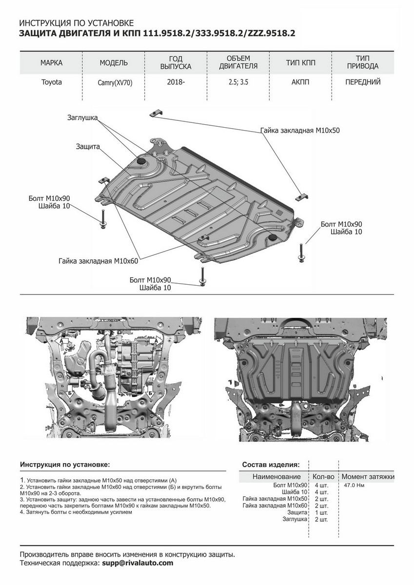 Защита картера и КПП Rival (увеличенная) для Lexus ES XV70 (V - 2.0; 2.5) 2018-н.в./Toyota Camry XV70 (V - 2.0; 2.5; 3.5) 2018-н.в., алюминий 4 мм, с крепежом, 333.9518.2