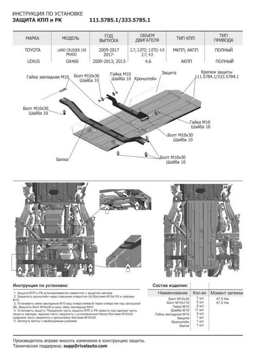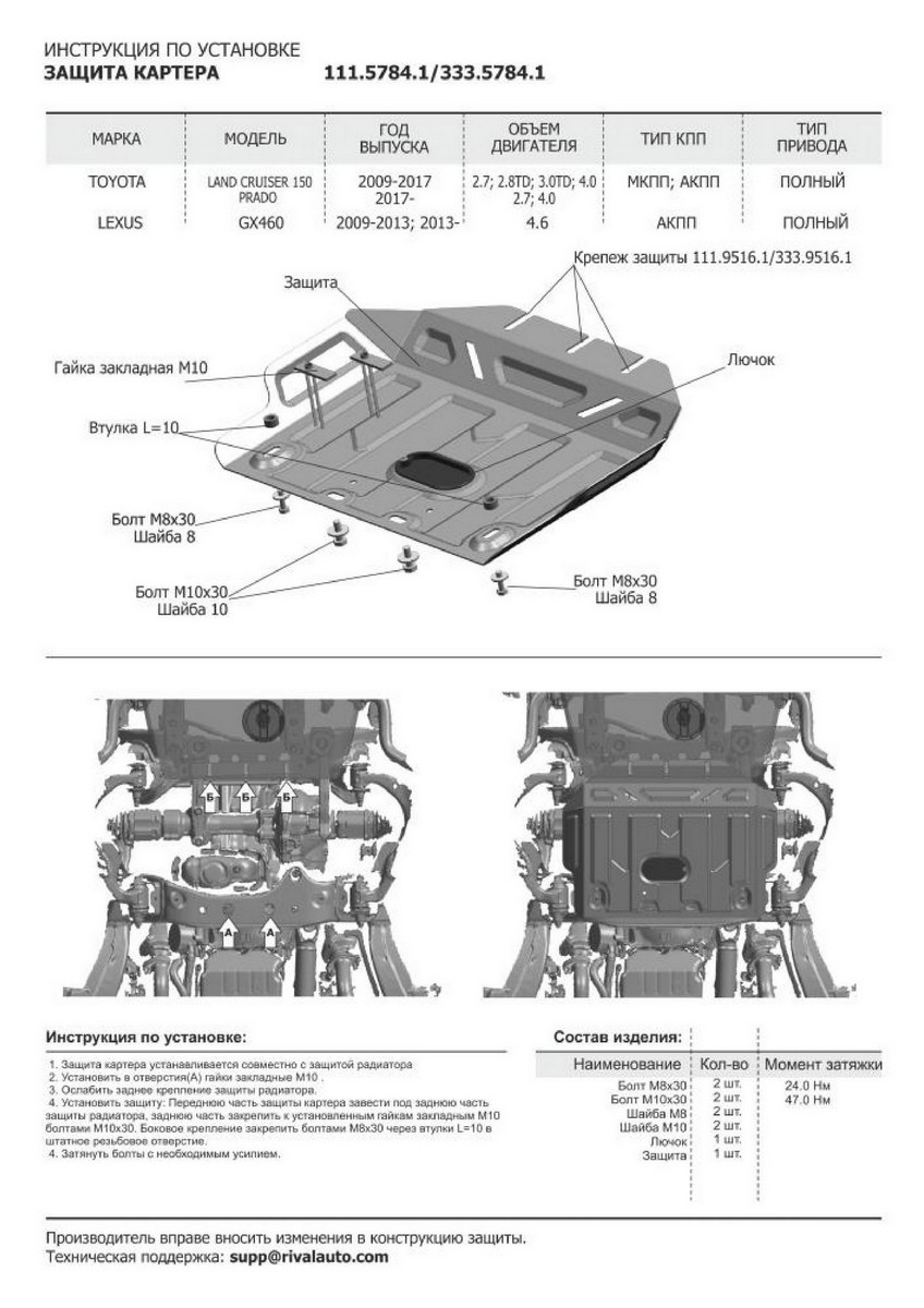 Защита радиатора, картера, КПП и РК Rival для Lexus GX 460 (V - 4.6) 2009-2013/Lexus GX 460 (V - 4.6) 2013-н.в./Toyota Land Cruiser 150 Prado (V - 2.7; 3.0d; 4.0; 2.8d) 2009-2013/Toyota Land Cruiser 150 Prado (V - 2.7; 3.0d; 4.0; 2.8d) 2013-2017/Toyota Land Cruiser 150 Prado (V - 2.7; 2.8d; 4.0) 2017-н.в., алюминий 4 мм, с крепежом, K333.9516.1