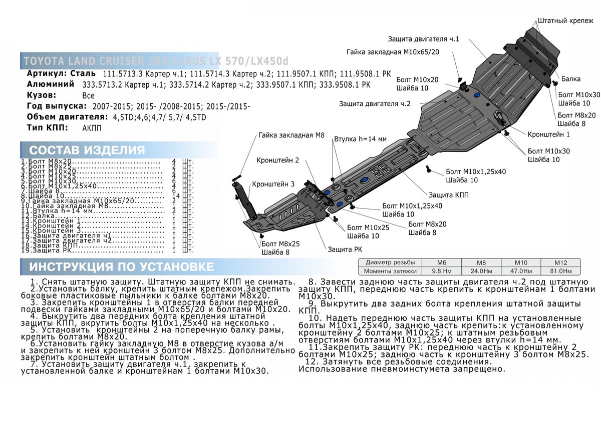 Защита картера Rival (часть 1) для Lexus LX (V - 5.7) 2008-2015/Lexus LX (V - 4.5d; 5.7) 2015-н.в./Toyota Land Cruiser 200 (V - 4.5d; 4.7) 2007-2015/Toyota Land Cruiser 200 (V - 4.5d; 4.6) 2015-н.в., алюминий 4 мм, с крепежом, 333.5713.2